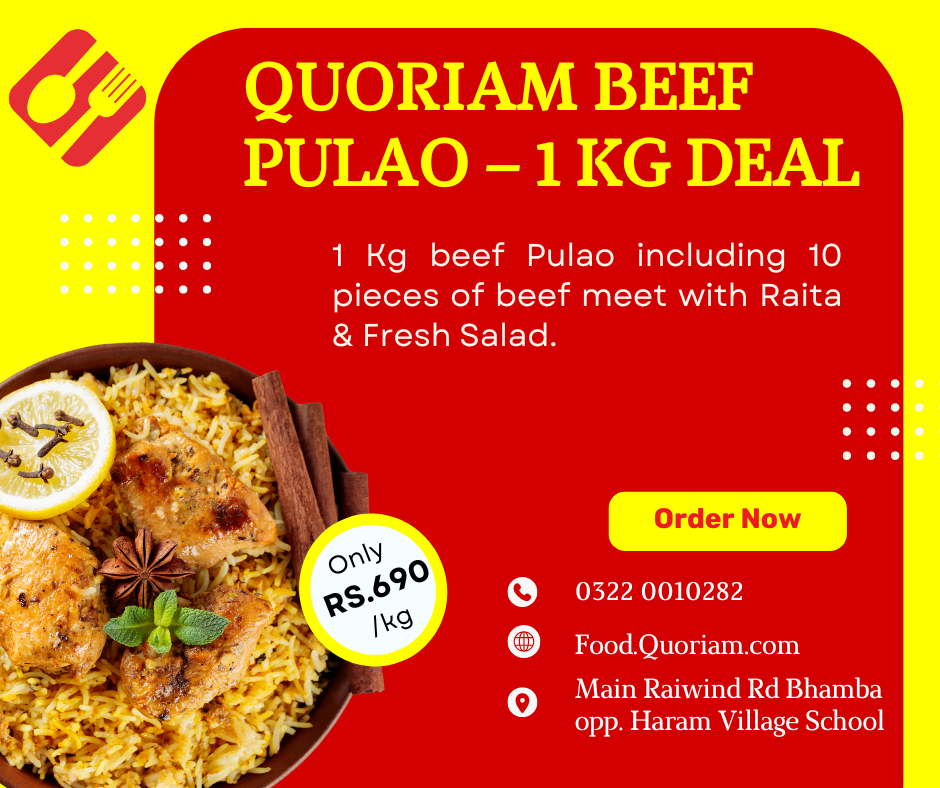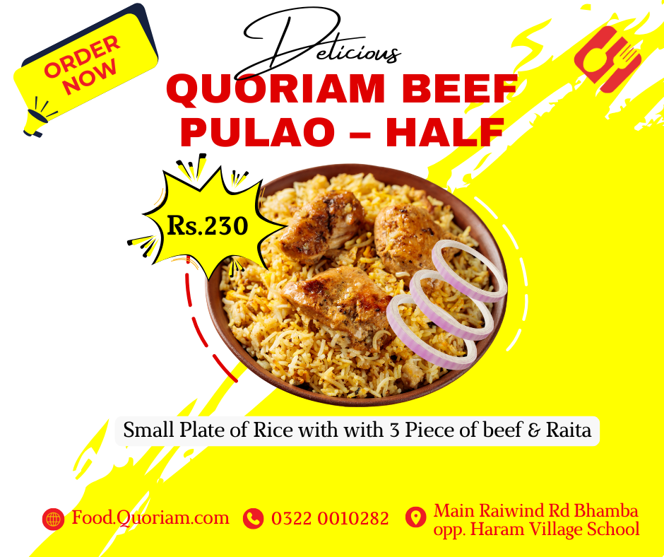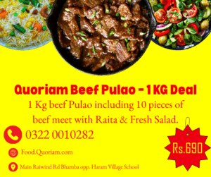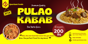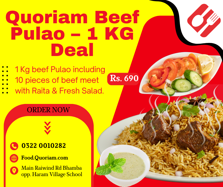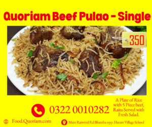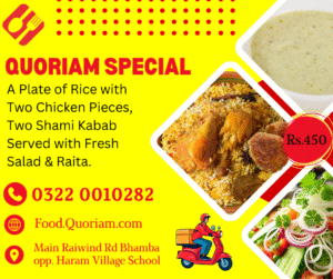 A Plate of Rice with Two Chicken Pieces, Two Shami Kabab Served with Fresh Salad & Raita
