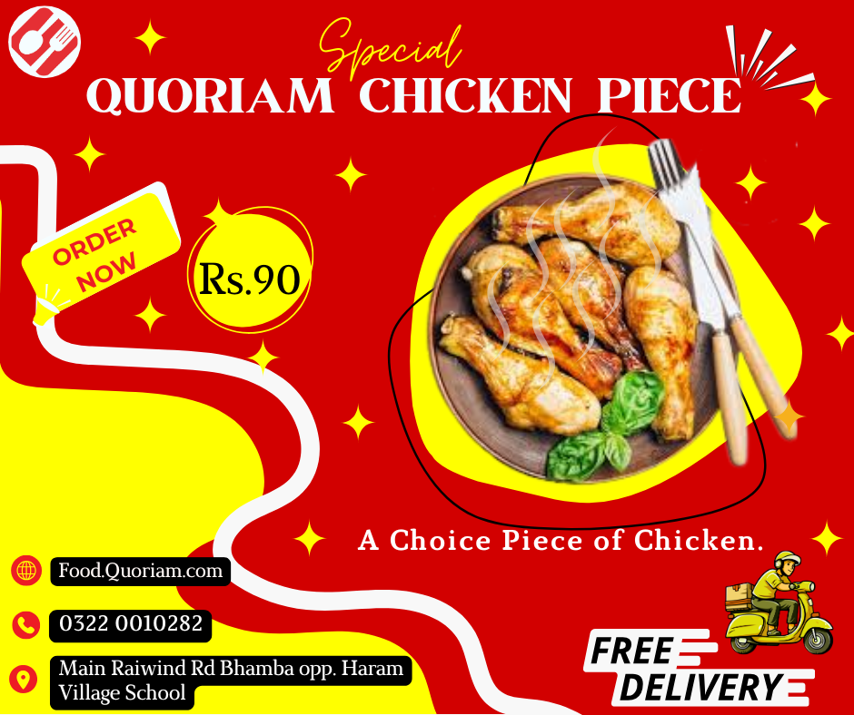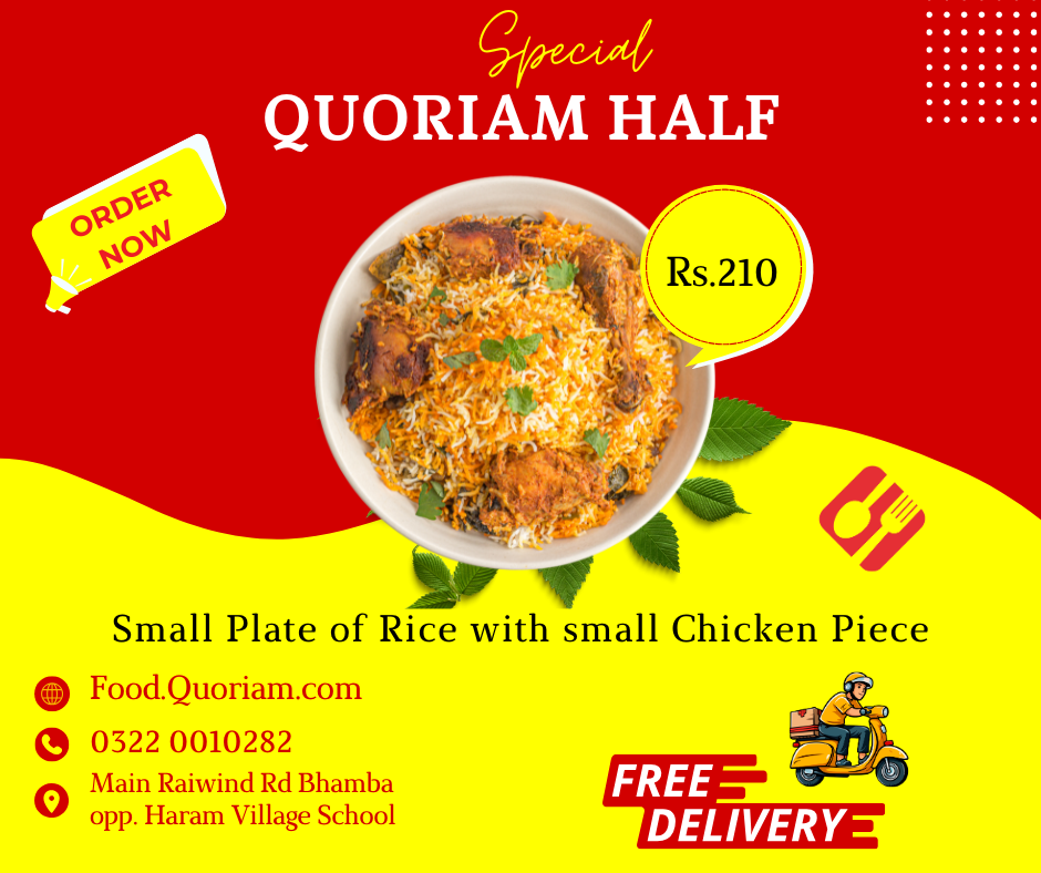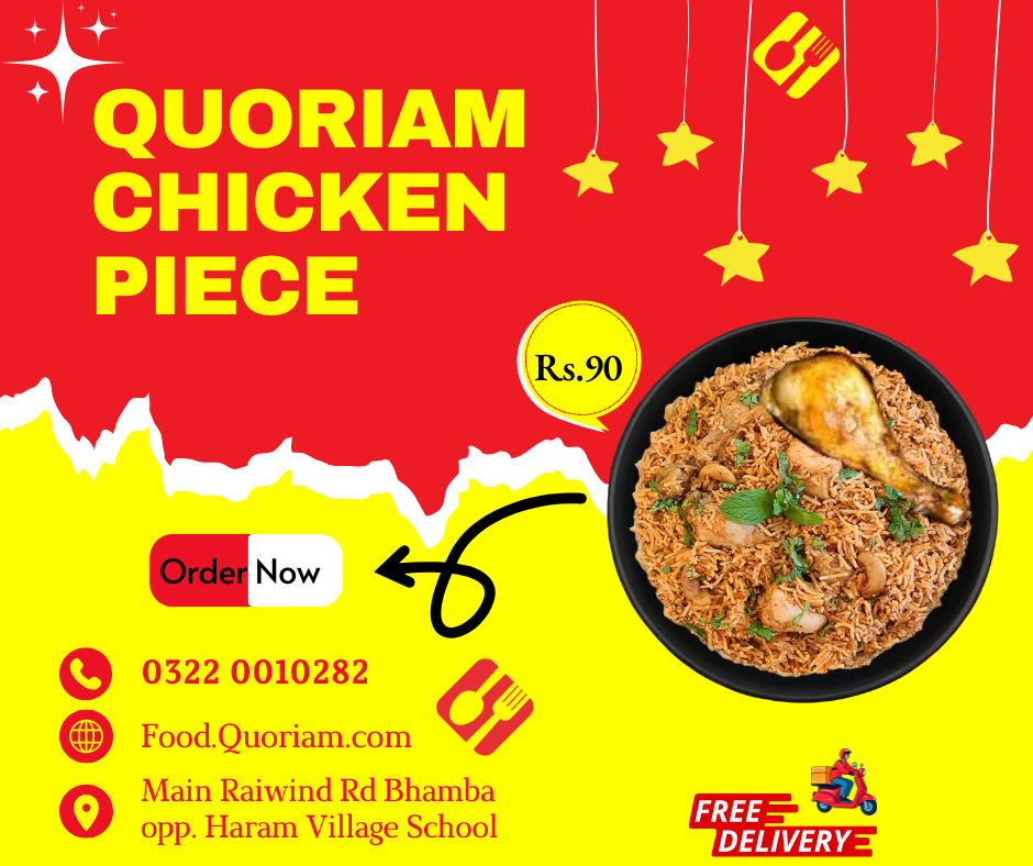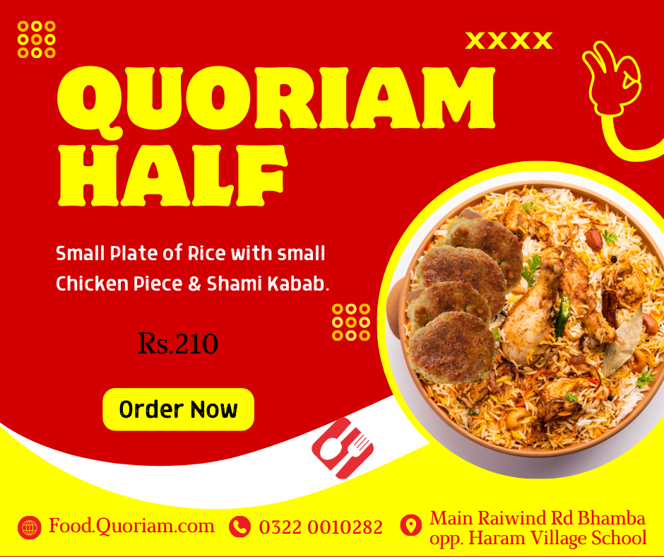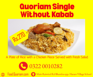 A Plate of Rice with a Chicken Piece of Your Choice, Shami Kabab Served with Fresh Salad.